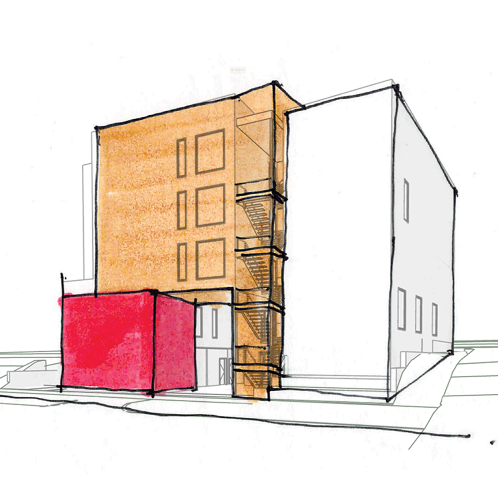 This early sketch shows the massing decisions and architectural features that were a part of b9 architects’ design concept.